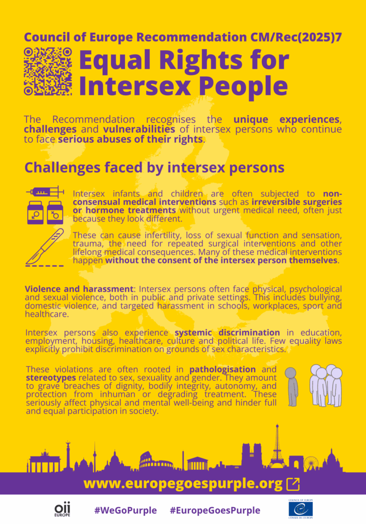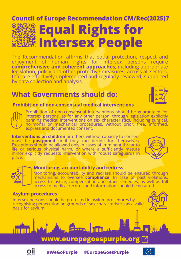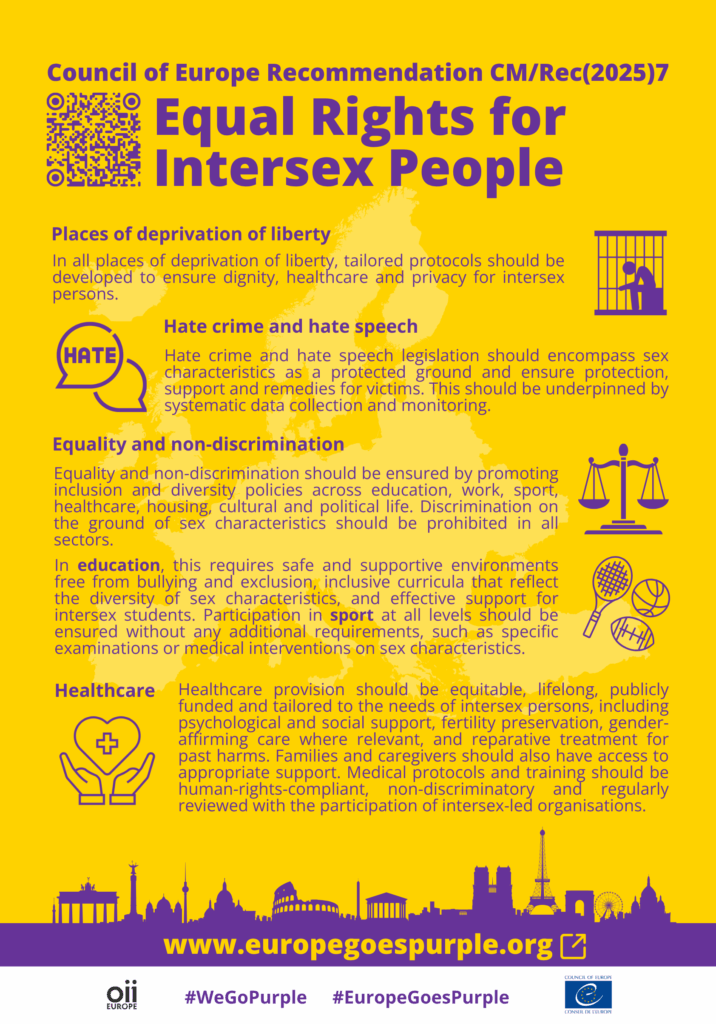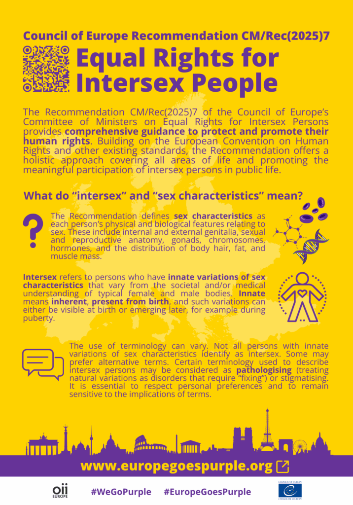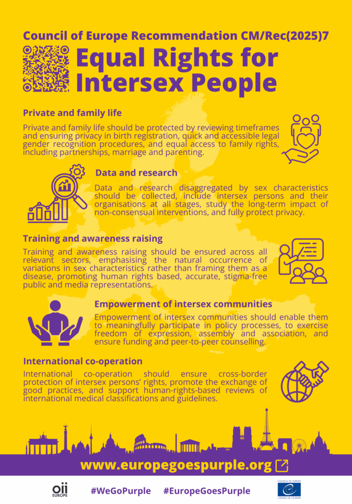 The Council of Europe Committee of Ministers Recommendation CM/Rec(2025)7 to member States on Equal Rights for Intersex Persons was adopted on Oct 7th. It provides comprehensive guidance on how to protect and promote the human rights of intersex persons. Based on the European Convention on Human Rights and other existing standards, the Recommendation takes a holistic approach, covering all areas of life and encouraging the meaningful participation of intersex people in public life.